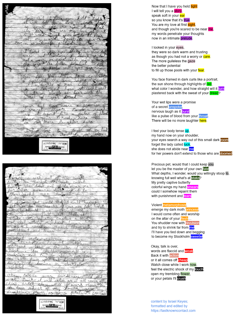 Keyes's suicide note is also highly reminiscent of a book he described as his first experience reading from the killer's point of view: Intensity by Dean Koontz. This book includes several intentional car crashes, a character who believes "there's a worm in every butterfly," and countless references to insects and spiders meeting untimely ends through crushing or other means. Keyes calls his muse "vermin" and "you clever little worm," and tells them "crushed like a bug you still die." On the second sheet, he refers to them as "my pretty captive butterfly" and "my dark moth princess." This sheet is written in a decidedly different style. The rhyming scheme is simpler, there is no refrain, and the parallels between Keyes's writing and Intensity are even more pronounced than they were on the first sheet.