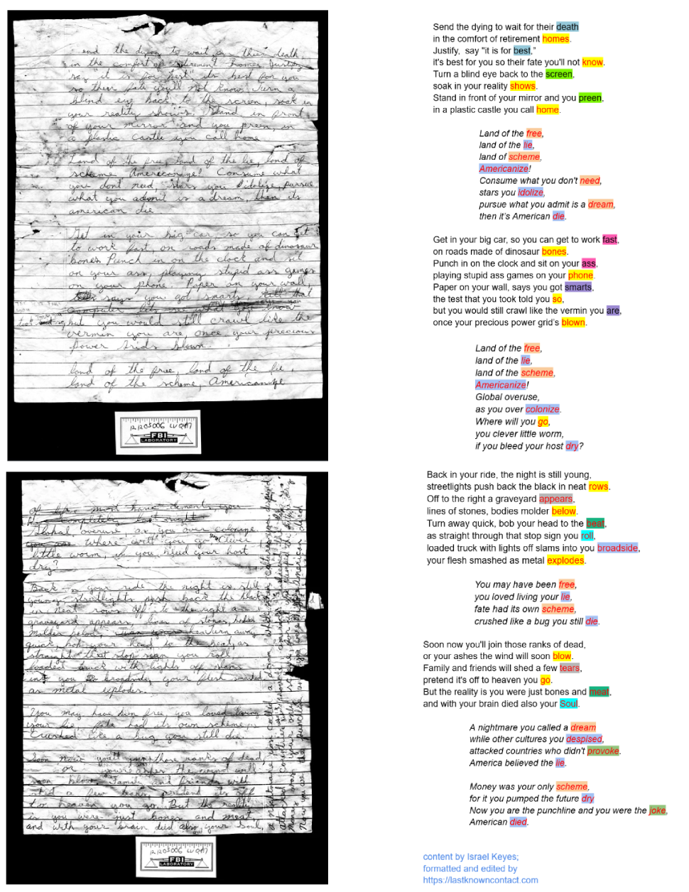 Our researchers were discussing this theory with the team from Somewhere In The Pines, and Joshua Ash brought up a compelling point: the words on the first sheet sound so incredibly similar to Rage Against The Machine's song "No Shelter" that once you hear it, it is impossible to ignore. "No Shelter" includes the lyrics "American eyes, American eyes, view the world through American eyes." Could Keyes have misheard the lyrics and thought they were singing "Americanize?" He was a fan of the Red Hot Chili Peppers, who were highly influential in the music of Rage Against the Machine. It requires no stretch of the imagination to believe that he (mis)heard this song and was paying homage to it in his writing.